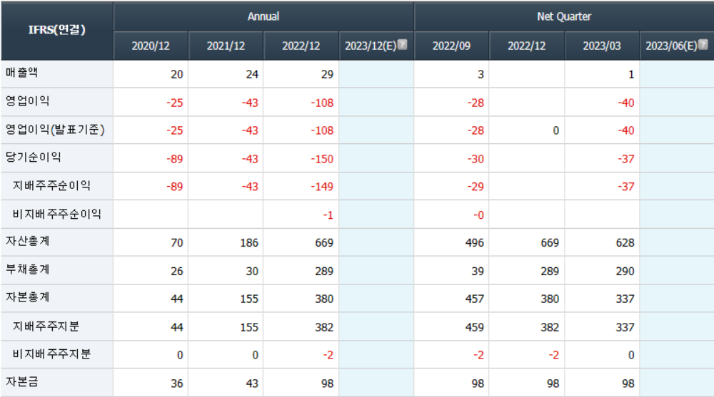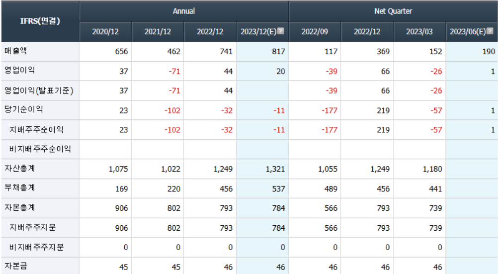 - 23년 3월 전년동기 대비 연결기준 매출액은 86.4% 감소, 영업손실은 145.9% 증가, 당기순손실은 133.8% 증가하였으며, 매출 급감 및 비용 증가로 인해 영업손실 폭이 증가.