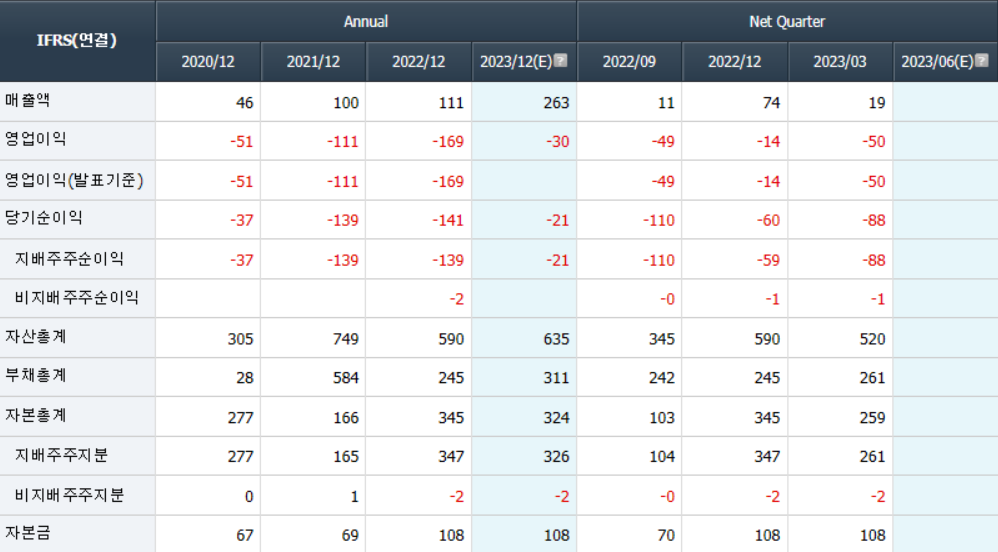 - 2023년 3월 전년동기 대비 연결기준 매출액은 190.8% 증가, 영업손실은 340% 증가, 당기순손실은 304.6% 증가하였으며, 동사는 전년 동기 대비 매출이 큰 폭으로 증가하며 외형성장을 이루었지만, 경상연구개발비 등 판관비의 증가로 적자 폭이 확대됨.