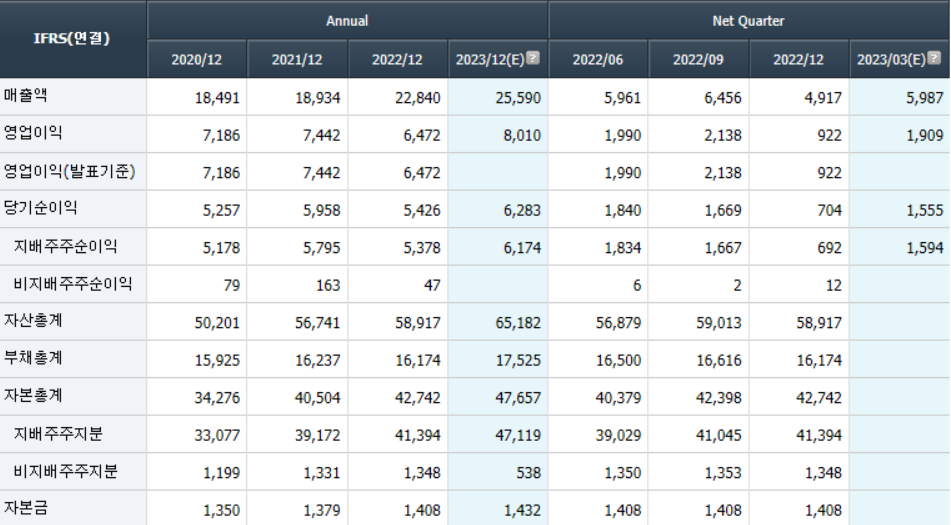 - 2022년 12월 전년동기 대비 연결기준 매출액은 11.3% 증가, 영업이익은 10.3% 증가, 당기순이익은 46.9% 감소하였으며, 원가율 상승과 판관비 증가에도 불구하고 매출 확대에 힘입어 영업이익이 증가함.
