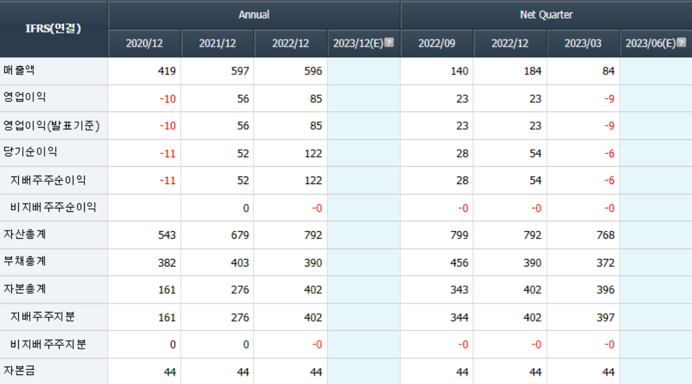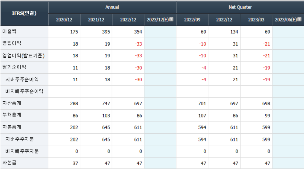 - 2022년 12월 전년동기 대비 연결기준 매출액은 10.5% 감소, 영업이익 적자전환, 당기순이익 적자전환하였으며, 장비매출 감소로 인해, 당분기 매출액은 354억원으로 전동기 대비 10.4% 감소, 영업손실 약 33억원.