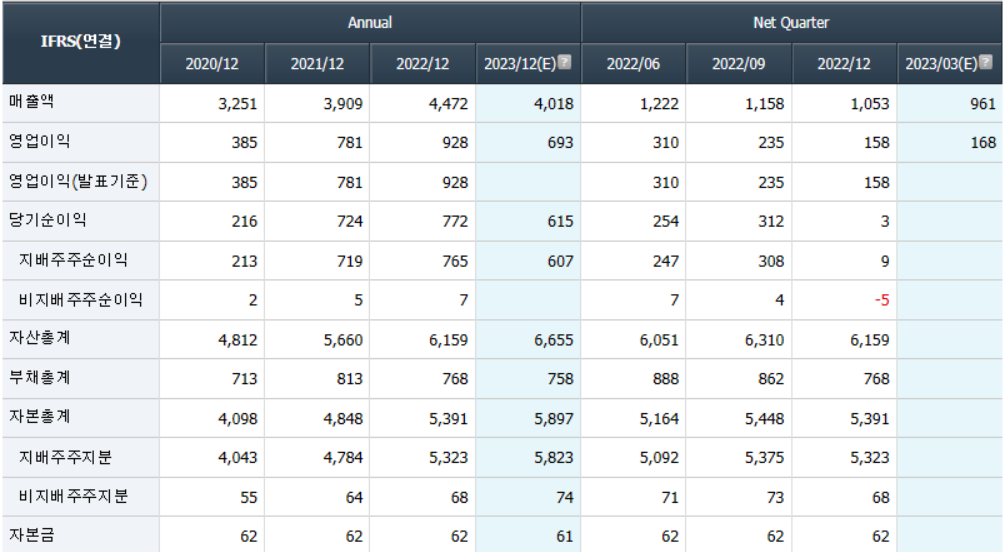 - 2022년 12월 연결기준 동사 매출은 4471.5억원으로 전년 동기 대비 증가하였으며, 영업이익은 927.9억원으로 전년 동기 대비 증가했으며 당기순이익은 772.4억원으로 전년 동기 대비 소폭 증가함.