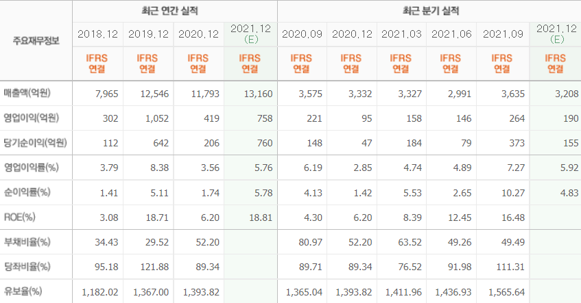 - 2021년 9월 전년동기 대비 연결기준 매출액은 13.4% 증가, 영업이익은 170% 증가, 당기순이익은 444.4% 증가하였으며, 국내외 대형 거래선과의 지속적인 거래 규모 확대를 통한 증대가 예상되고 있습니다.