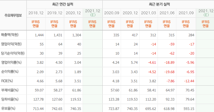 - 2021년 9월 전년 동기 대비 연결기준 매출액은 2.7% 증가, 영업이익 적자전환, 당기순이익 적자 전환하였으며, 외형 성장은 정체된 가운데 원가율이 대폭 상승했고, 판관비 등 비용 증가가 겹쳐 대규모 영업손실 및 순손실을 보이며 적자 전환되었습니다.
