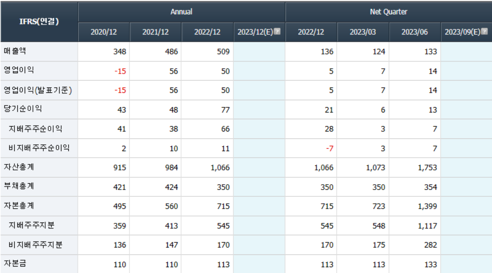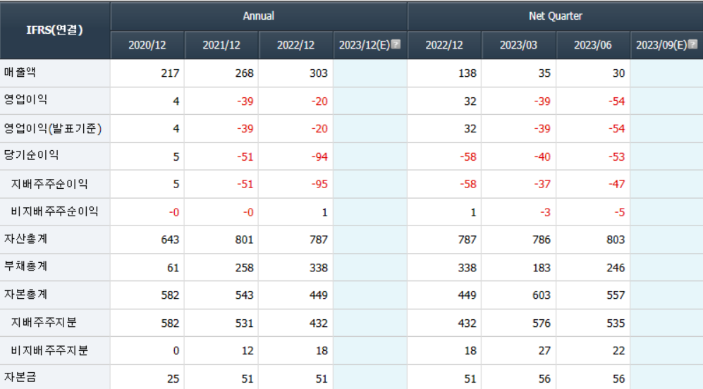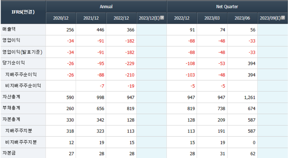 - 2023년 3월 전년동기 대비 연결기준 매출액은 0.3% 감소, 영업손실은 27.4% 증가, 당기순손실은 10.7% 증가하였으며,서비스 확대를 위한 연구 개발비의 증가하였으며, 매출액 대비 연구개발비의 비율이 2022년도에 42.1%에서 당분기 80.6%로 증가.