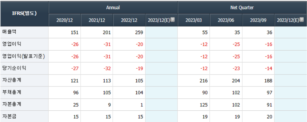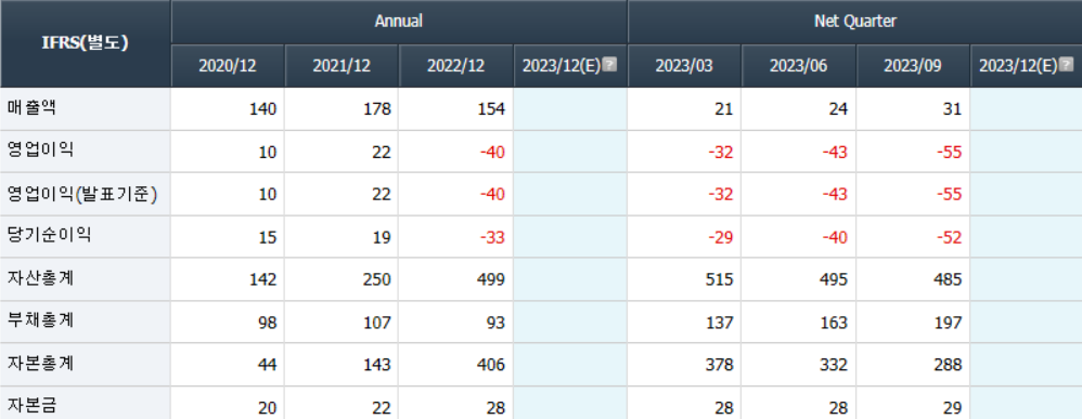 - 2023년 9월 전년동기 대비 별도기준 매출액은 34.2% 감소, 영업이익 적자전환, 당기순이익 적자전환하였으며, 영업수익은 감소하고 비용 비율은 늘어났으며, 매출대비 연구개발비 비용은 전년도 말 18.2%인데 비해 2023년 9월 말 25.4%임.