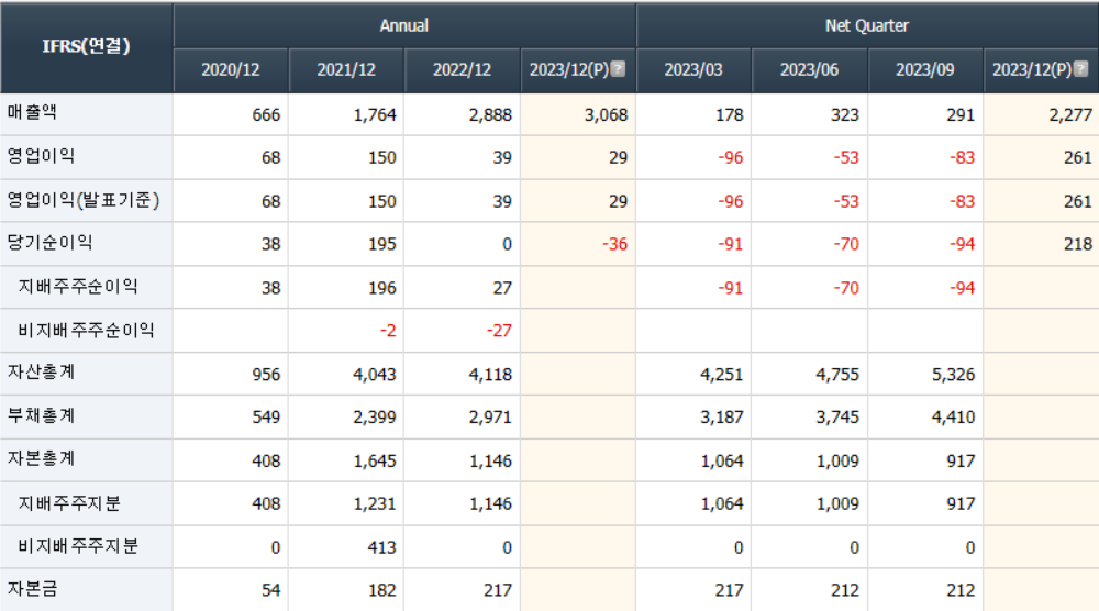 - 2023년 9월 전년동기 대비 연결기준 매출액은 44% 감소, 영업손실은 759.7% 증가, 당기순이익 적자전환하였으며, COVID-19, 우러 전쟁 등 전방산업 투자 지연에 따라 수주 감소함.
