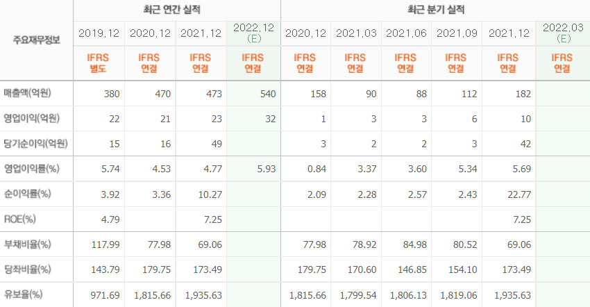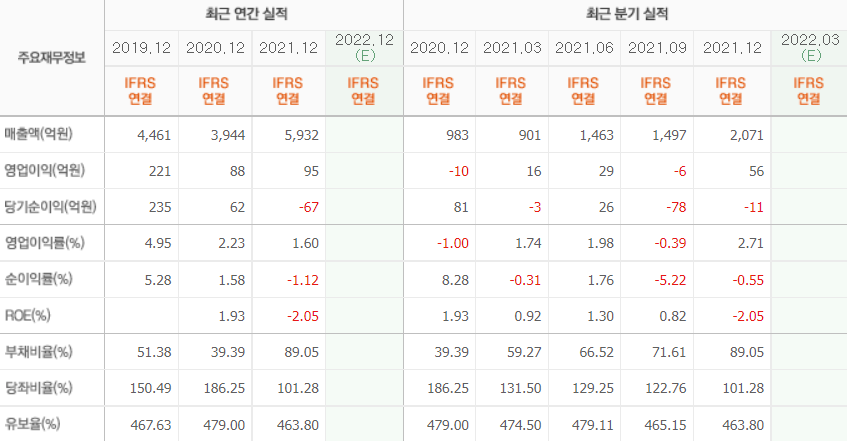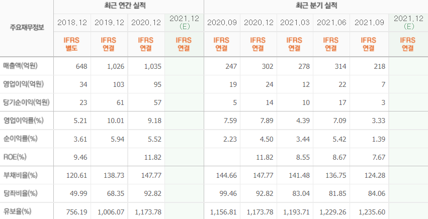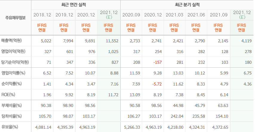 - 2021년 9월 전년동기 대비 연결기준 매출액은 30.4% 증가, 영업이익은 60.2% 감소, 당기순손실은 188.9% 증가하였으며, 지난해 증설한 신공장으로 인해 가격이 비교적 높게 형성된 제품 생산량이 증가하면서 미국 시장 확대에 긍정적인 영향을 미칠 것입니다.