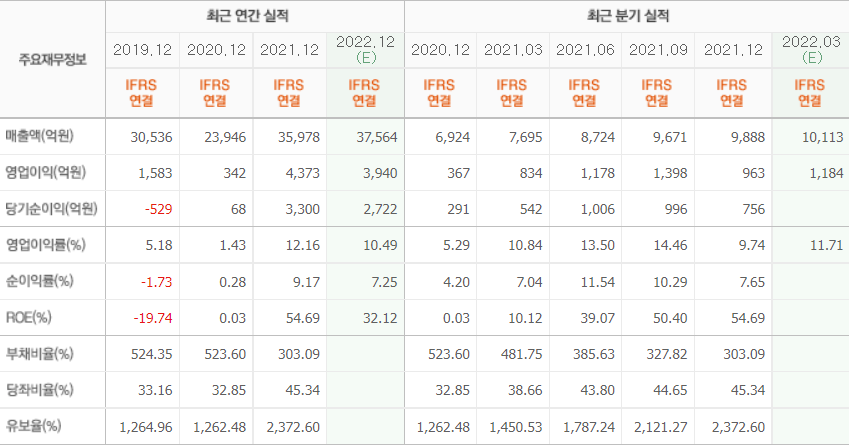 - 2021년 9월 전년동기 대비 연결기준 매출액은 53.3% 증가, 영업이익 흑자전환, 당기순이익 흑자 전환하였으며, 원가율 상승과 판관비 증가에도 불구하고 분기 사상 최대 실적에 힘입어 영업이익이 흑자 전환하였습니다.