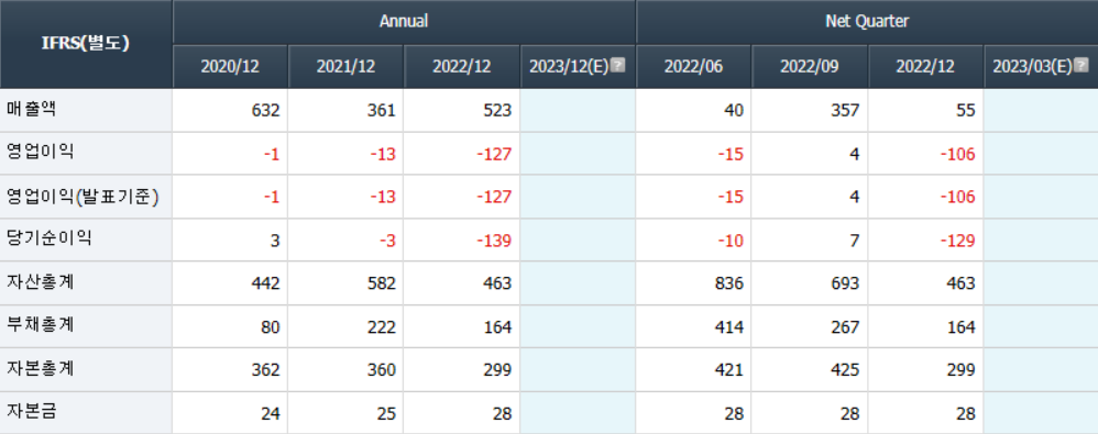 - 2022년 12월 전년동기 대비 별도기준 매출액은 44.9% 증가, 영업손실은 903.6% 증가, 당기순손실은 4,603.7% 증가하였으며, 매출 확대에도 불구하고 원가율 상승과 판관비 증가의 영향으로 영업적자 폭이 크게 늘어남.