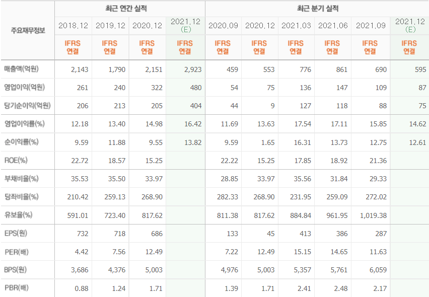 - 2021년 9월 전년 동기 대비 연결기준 매출액은 45.6% 증가, 영업이익은 59.1% 증가, 당기순이익은 69.4% 증가하였으며, 주요 고객사내 시장점유율 1~2위를 기록하면서 지배력을 더욱 강화시켜 나가고 있으며, 적극적인 기술개발을 바탕으로 점유율을 지속적으로 확대하고 있습니다.