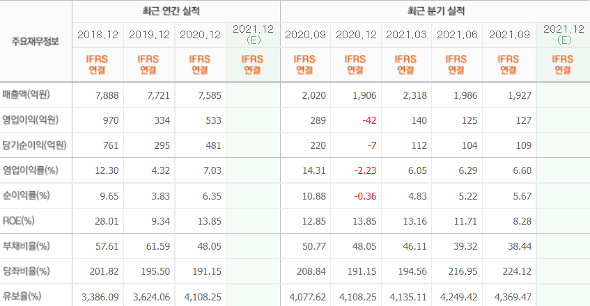 - 2021년 9월 전년 동기 대비 연결기준 매출액은 23.5% 증가, 영업이익은 80% 증가, 당기순이익은 242.6% 증가하였으며, 전체적인 사업부에서 매출액이 증가하였고, 판매비와 관리비 증가 억제에 성공하며 수익성이 크게 개선되어 영업이익이 80% 증가하였습니다.