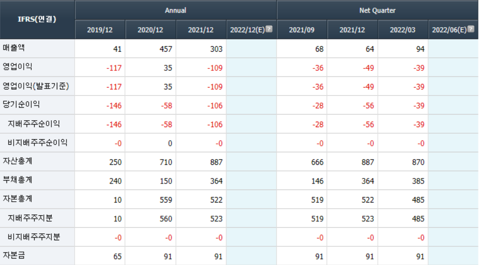 - 2021년 12월 전년동기 대비 연결기준 매출액은 12% 감소, 영업손실은 10.4% 감소, 당기순손실은 33.8% 증가하였으며, 영업손실이 지속되고 이자비용 등의 부담도 여전해 당기순손실 지속됨.